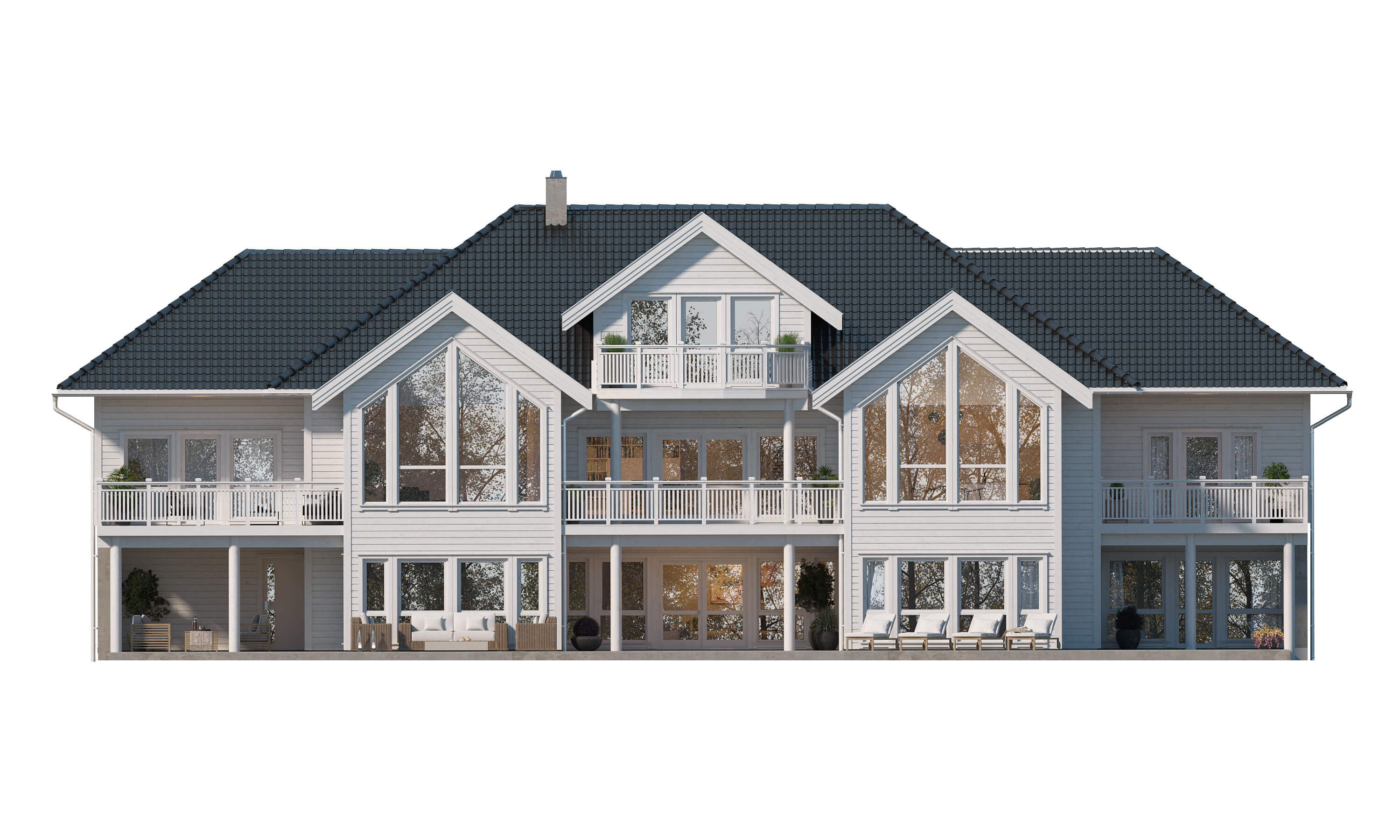 Boligen har seks soverom, seks bad, trimrom, stort kontor, tre stuer, en romslig kjøkkenløsning og uteområder som kan nytes uansett hvilken etasje du befinner deg i. Walk-in garderober og praktisk vaskerom sørger for orden i det daglige.